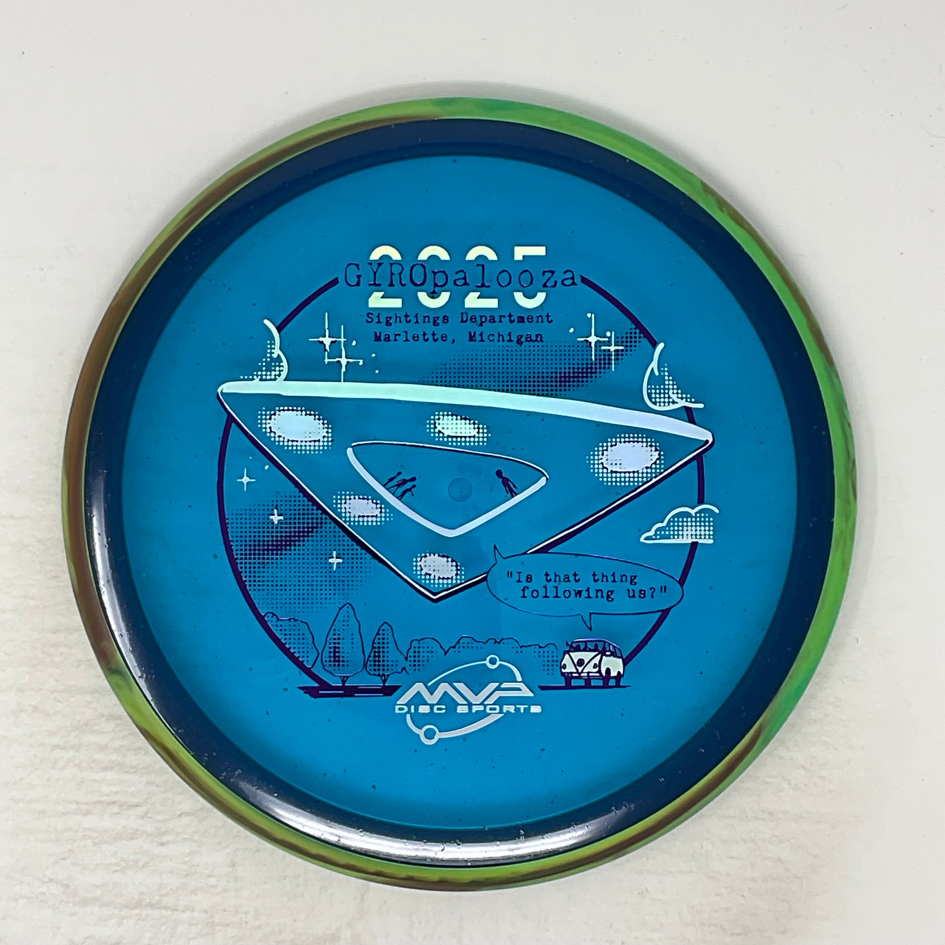 For the second time ever, the Pyro is releasing with a non-Prism rim, and this time it's with a gorgeous Particle Glow core! Featuring an illustration by ZAM based on real UFO sighting from the Sightings Department, the Pyro has rarely looked so good. Known for its controllably overstable but glide-filled flight, the Pyro has proven itself a staple midrange in many bags. Add this gorgeous Particle gem to your collection, exclusively in the 2025 GYROpalooza Box!